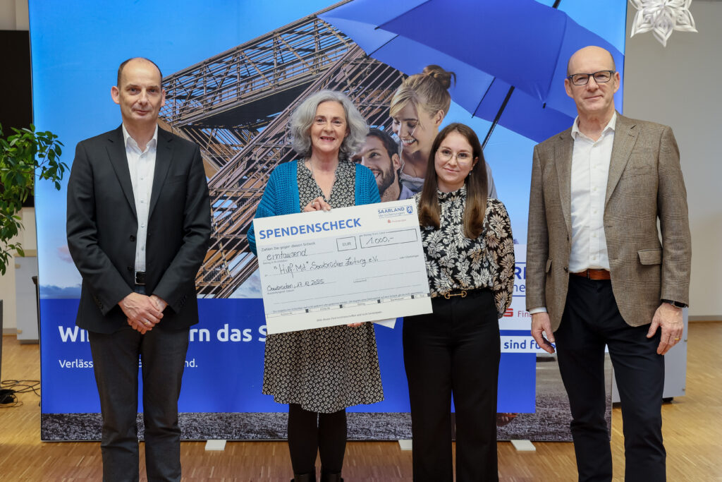 Die SAARLAND Versicherungen spendeten auch 2025 erneut an soziale und karitative Einrichtungen des Landes. Mit der Spendenaktion drücken die SAARLAND Versicherungen ihren Dank und ihre Anerkennung für den unermüdlichen Einsatz der einzelnen Einrichtungen und Vereine aus. Der Vorstand der SAARLAND Versicherungen mit Eva Scherer, 2.v.l., Geschäftsführerin von Hilf-Mit! bei der Spendenübergabe.